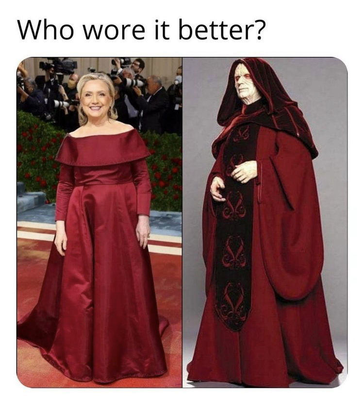 OK, so let’s lighten up a little bit. This week also was the Met Gala. That’s the one where AOC wore a Tax The Rich message painted on a dress costing more than a living wage. Well the star of this year’s extravagant douchbaggery was none other than Hillary Clinton!
