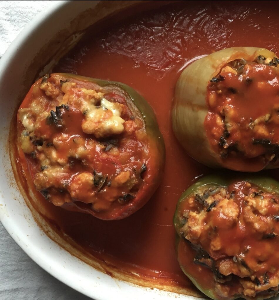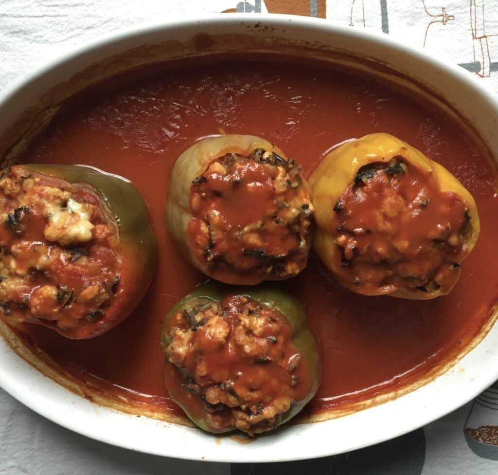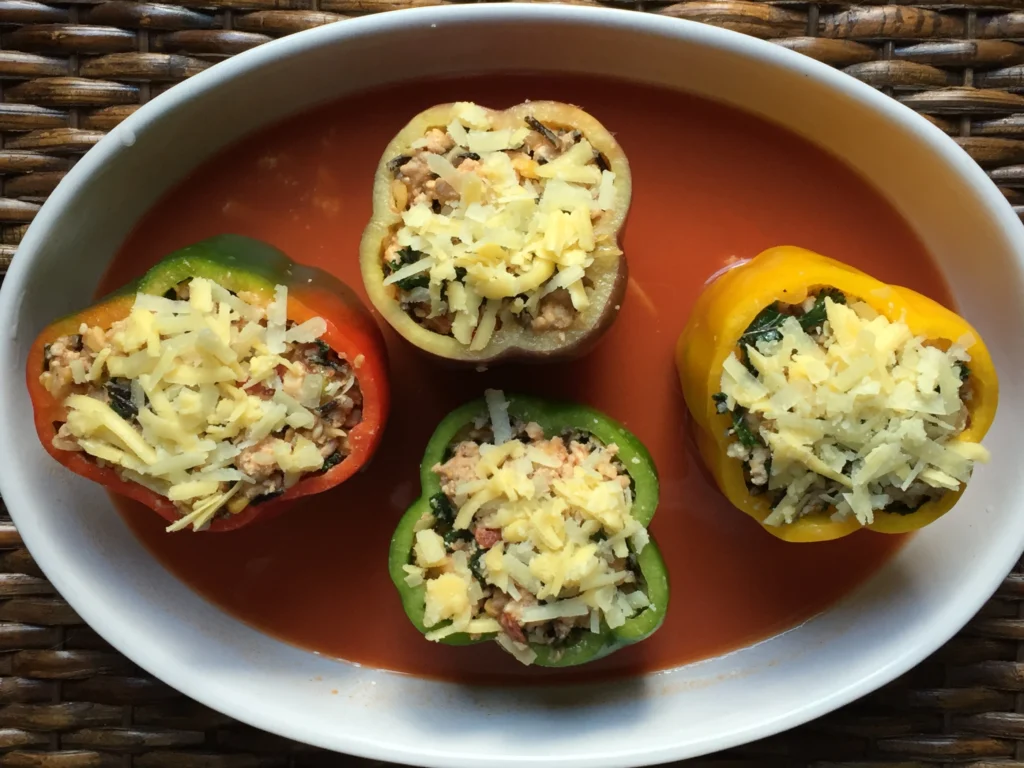 Stuffed bell peppers are a delicious easy meal that is both filling and nutritious. You can add whatever you like there is no wrong way to make the filling, I like to keep it simple, using easily accessible ingredients that most home cooks have in their pantry and refrigerator, sometimes I add kale and par cooked split yellow peas. For a vegetarian option substitute black beans for the ground meat. Here’s how to make it: