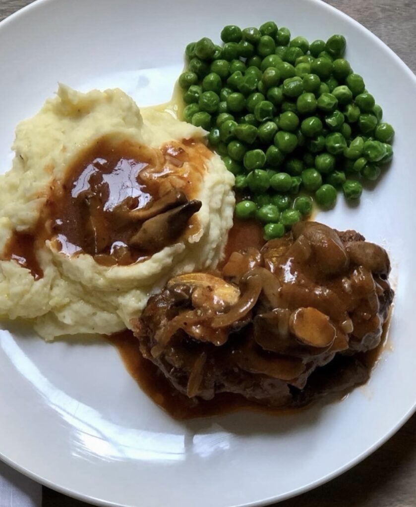 I remember as a child it was a treat when my Mom bought a tv dinner, to be honest they were not very good but still I looked forward to the occasional frozen meal eaten on a tv tray while watching tv. Salisbury steak, a simple economical meal is not steak its ground beef served with a rich gravy. Comfort on a plate, much needed after the elections. Here’s how to make it: