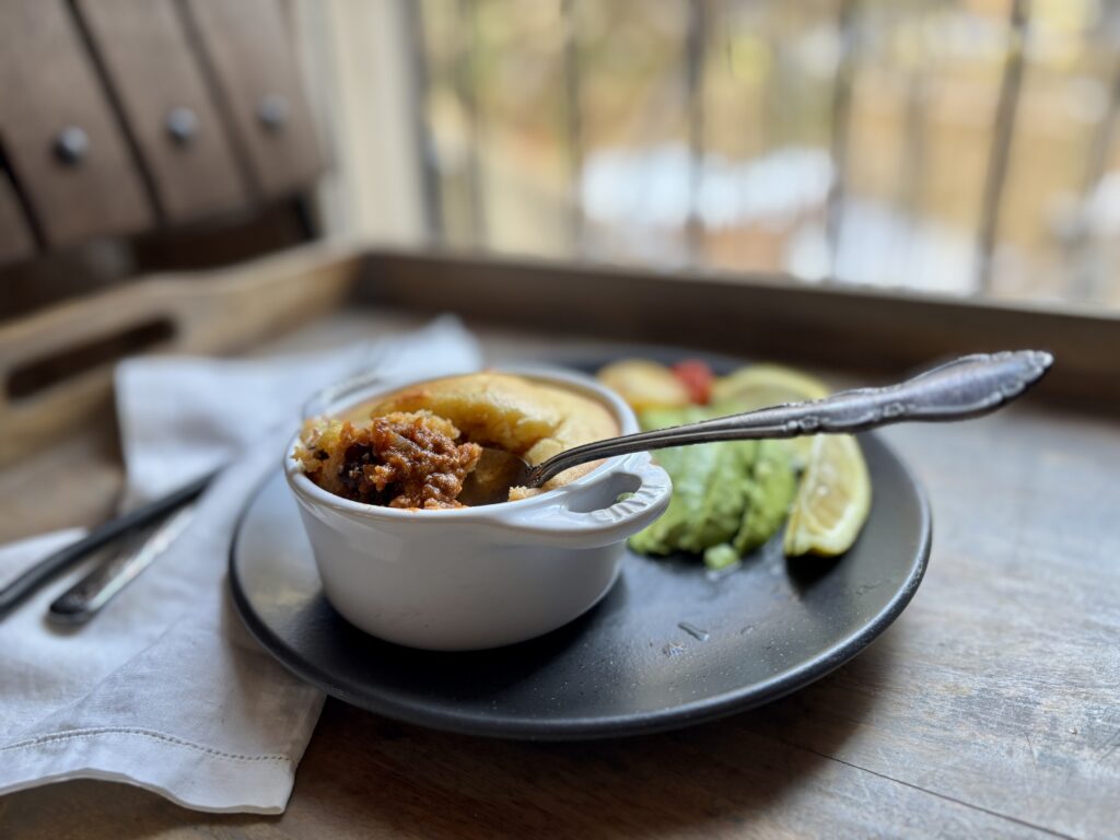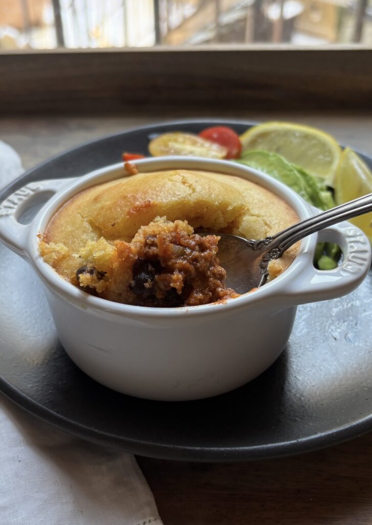 Cornbread and chili is a match made in heaven. Instead of baking the cornbread separately I topped the chili with the batter and baked it together a great way to use leftover chili. It’s delicious and so simple to make. You can add jalapeño and cheese to the cornbread batter or keep it plain any way you choose it’s a delicious meal. Check out the recipe for chili here or use your own recipe. Here’s how to make the cornbread: