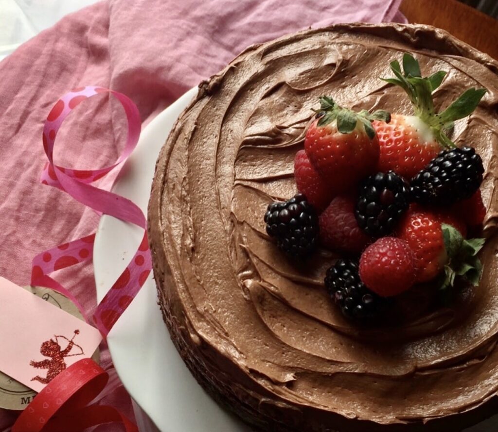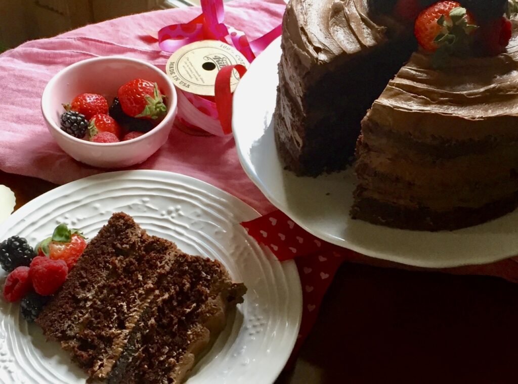 In my opinion Valentines Day and chocolate are synonymous. This chocolate layer cake is simple to make, moist and delicious. A 3 layer chocolate cake with whipped chocolate ganache frosting, (ganache is simply chocolate melted in some hot heavy cream) served with some berries and whipped cream complete this decadent dessert. Here’s how to make it: