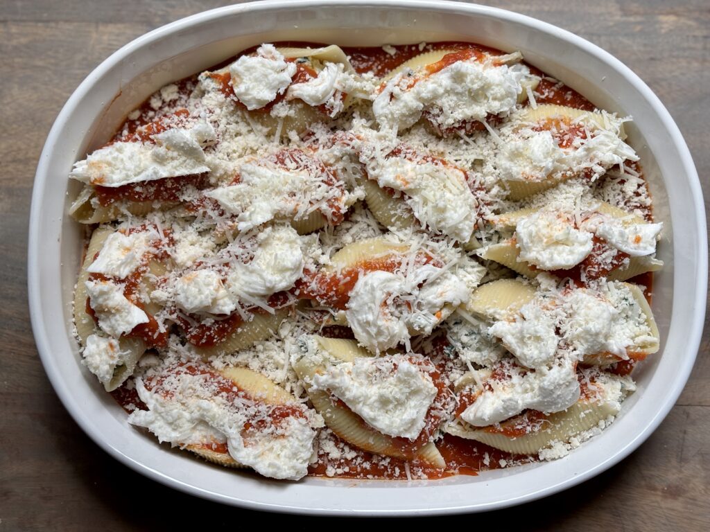 Spoon some more sauce on top of the shells, add some mozzarella and more grated cheese. Bake uncovered in a 375 degree oven until bubbly and cheese is melted 30-45 minutes.