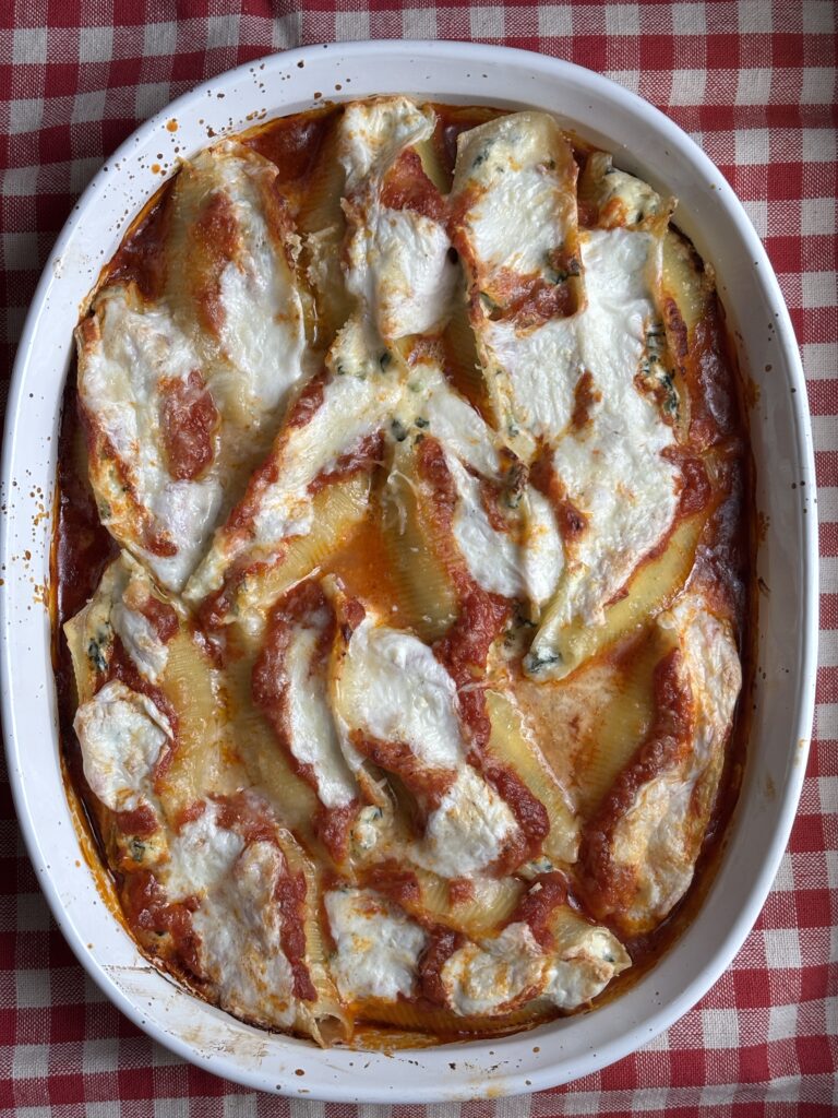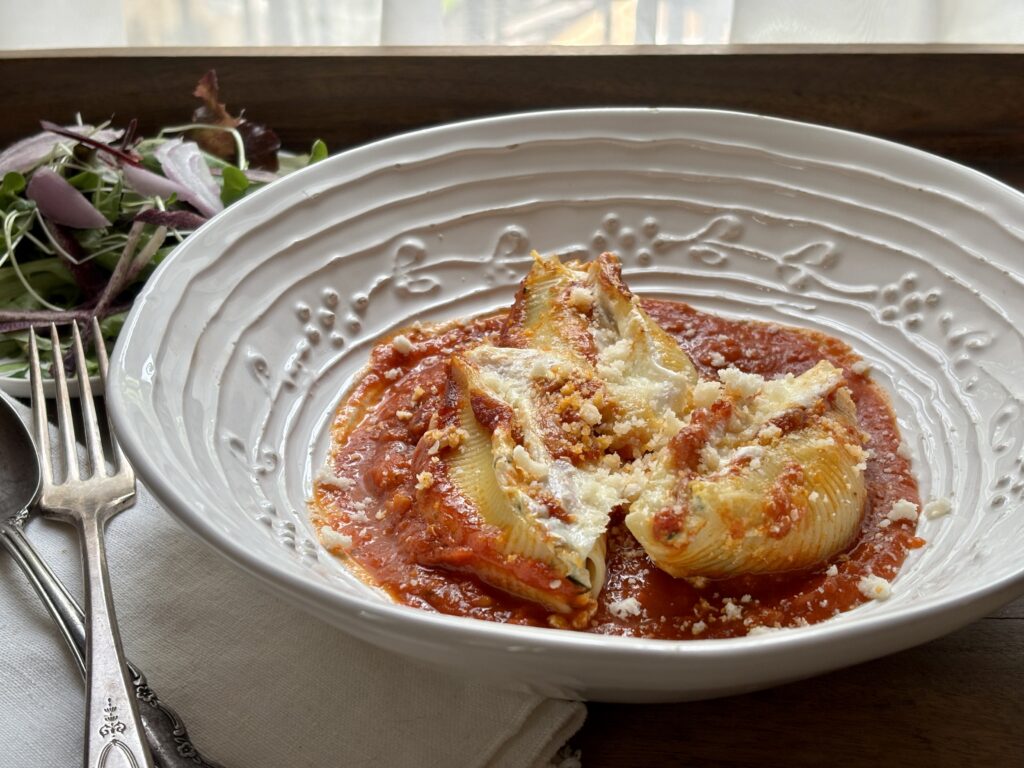 Stuffed shells is a delicious baked pasta dish. Use jumbo shells and stuff with whatever filling you like, I chose ricotta and spinach. You can use your favorite tomato sauce, I like Marcella Hazan’s easy and very tasty sauce. It’s hard to resist this cheesy, filling dish that is so simple to make. Here’s how to make it: